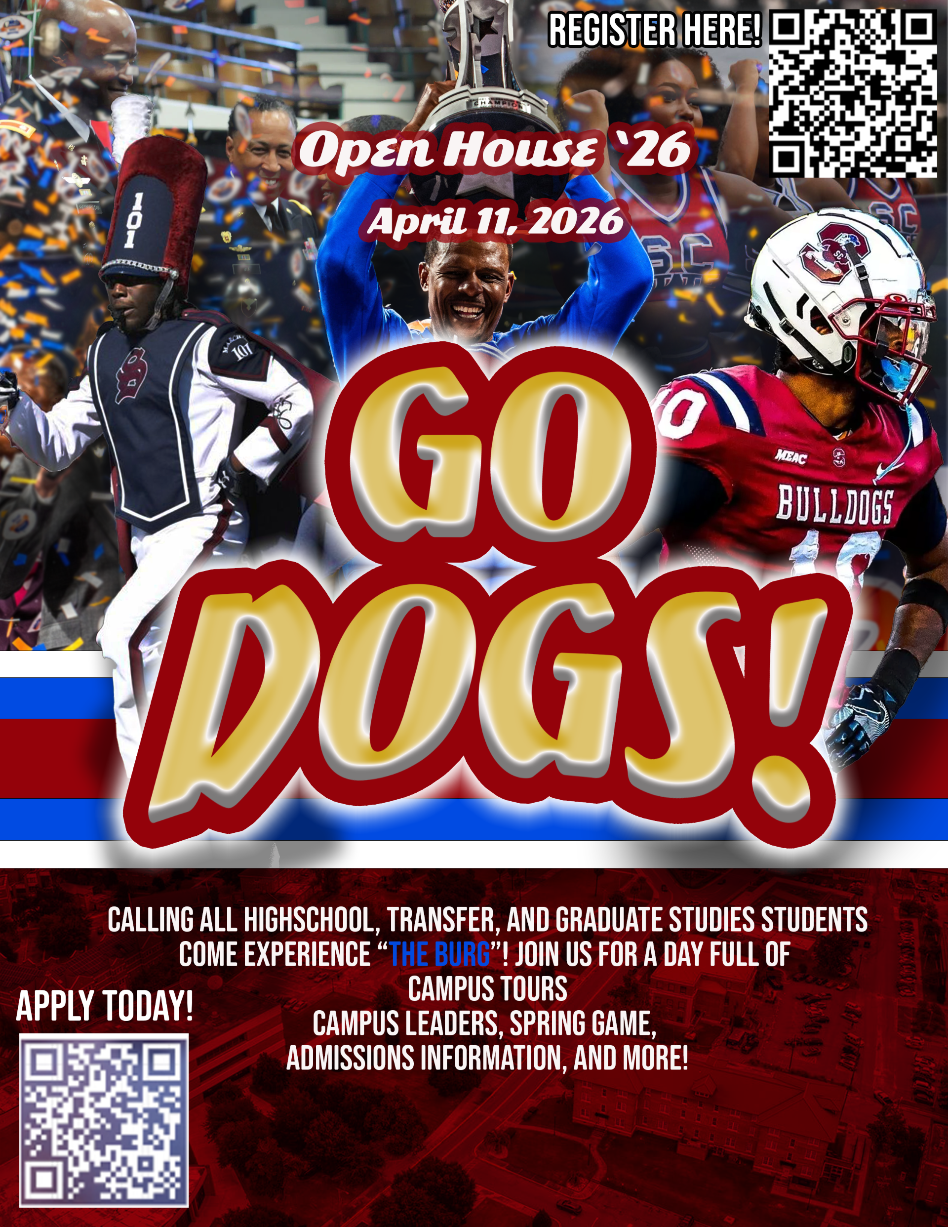 2026 Spring Open HouseSaturday, April 11, 2026 at 9:00 AMEastern Daylight Time UTC -04:00Smith-Hammond-Middleton Memorial Center200 Buckley StreetOrangeburg, SC 29115United States Check-in will begin at 9:00AM Smith Hammond Middleton Memorial Center Spring Open House is perfect for students who want to learn what it takes to become a part of the rich legacy and tradition of South Carolina State University. Open House provides you and your family the opportunity to talk with current SC State students, faculty, and staff. In addition: The University’s student ambassadors will lead you on tours of our beautiful campus. Our admission staff will be on hand to answer your questions, guide you through the application process. College Fair with each college/school on campus so that you may talk 1:1 with faculty about your major Battle of the Bands Marching 101 Performance SC State Cheerleaders Performance Spring Football Game The event begins in Smith Hammond Middleton Memorial Center at 9 a.m. Following the college fair, all guests are invited to stay for the spring football game (tickets will be provided the day of the event for all those who attend.) Loading...Registrant InformationFirst NameLast NamePreferred NameBirthdateBirthdateJanuaryFebruaryMarchAprilMayJuneJulyAugustSeptemberOctoberNovemberDecember123456789101112131415161718192021222324252627282930312026202520242023202220212020201920182017201620152014201320122011201020092008200720062005200420032002200120001999199819971996199519941993199219911990198919881987198619851984198319821981198019791978197719761975197419731972197119701969196819671966196519641963196219611960195919581957195619551954195319521951195019491948194719461945194419431942194119401939193819371936193519341933193219311930192919281927192619251924192319221921192019191918191719161915191419131912191119101909190819071906190519041903190219011900Email AddressMobile PhoneMailing AddressMailing AddressCountryStreetCityRegionPostal CodeMay we text important updates from SC State Admissions to this number?May we text important updates from SC State Admissions to this number?YesNoT-shirt SizeWhat size t-shirt do you wear?What size t-shirt do you wear?SmallMediumLarge1x2x3xProgram InformationAnticipated Student TypeCertificateCross Enrollment - Claflin StudentCross Enrollment - OC Tech StudentFirst Time FreshmanGraduate DegreeGraduate Non-DegreeHigh School/Dual EnrollmentReAdmitTransfer - 2 YrTransfer - 4 YrTransientTransient Claflin UnivTransient OCTCAnticipated Start TermFall 2017Fall 2018Fall 2019Fall 2020Fall 2021Fall 2022Fall 2023Fall 2024Fall 2025Fall 2026Fall 2027Fall 2028Fall 2029Fall 2030Spring 2017Spring 2018Spring 2019Spring 2020Spring 2021Spring 2022Spring 2023Spring 2024Spring 2025Spring 2026Spring 2027Spring 2028Spring 2029Spring 2030Summer 2018Summer 2019Summer 2020Summer 2021Summer 2022Summer 2022Summer 2023Summer 2024Summer 2025Summer 2026Summer 2027Summer 2028Summer 2029Summer 2030Academic Program InterestAccountingAgribusinessArt EducationBiologyBiology w/Applied Oncology Honors SciencesBusiness EconomicsChemistry EducationCivil EngineeringCivil Engineering/Fire ProtectionCommunications/BroadcastingCommunications/JournalismComputer EngineeringComputer ScienceCriminal JusticeCS with CybersecurityCybersecurityDrama, ProfessionalEarly Childhood EducationElectrical EngineeringElectrical Engineering TechElectrical Engr Tech & PhysicsElementary EducEnglish EducationEnglish ProfessionalFam & Consumer Sci/Child DevFam & Consumer Sci/Food ServFam And Consumer Sc/Fash MdsgFamily And Consumer Sc BusinesHistoryHistory Afcn American StudiesHistory International StudiesIndustrial EngineeringIndustrial TechnologyManagementMarketingMathematicsMathematics And Computer SciMathematics EducationMechanical EngineeringMechanical Engineering TechMechatronic EngineeringMiddle Level EducationMusic Education-Choral/PianoMusic Education-Choral/VoiceMusic Education/InstrumentalMusic IndustryNuclear EngineeringNutrition & Food Mgt/Ntr OptPhys Ed/Physical Activity MgtPhys Ed/Sport CommunicationPhysical Ed/Applied Ex SciencePhysical Ed/Health Ed ServicesPhysical EducationPhysicsPhysics/ Astronomy OptionPhysics/Health Physics OptionPhysics/Medical Physics OptionPolitical SciencePolitical Science/Pre-LawPolitical Science/Public AdmProf Chem/Grad Sch & IndustryProf Chemistry/Enviornomental ScienceProf Chemistry/Pre-Health CareerProf Chemistry/RadiochemistryProfessional Land SurveyingPsychologySocial Studies EducationSocial WorkSociologySp Ed/Educable Mentally RetardSp Ed/Emotionally HandicappedSp Ed/Learning DisabilitiesSpeech Pathology & AudiologyStu Art/Photography/PrintmakinStudio Art/Ceremics/SculptureStudio Art/Digital MediaStudio Art/Painting/DrawingUndecided/Degree SeekingUndergrad Transient Non-DegreeDo you have a current application on file?Do you have a current application on file?YesNoVisit DetailsAre you:Are you:StudentParent/GuardianTeacher/CounselorOther (Organization, etc.)High School/Organization Name, if applicable.If you are high school/organization rep, please list the number of students you are bringing.Do you have needed accommodations that we can prepare for? (example: dietary restrictions, accessibility concerns, etc)Do you have needed accommodations that we can prepare for? (example: dietary restrictions, accessibility concerns, etc)YesNoPlease describe needed accommodations:Are you interested in receiving a campus tour the day of the event?Are you interested in receiving a campus tour the day of the event?YesNoSubmit